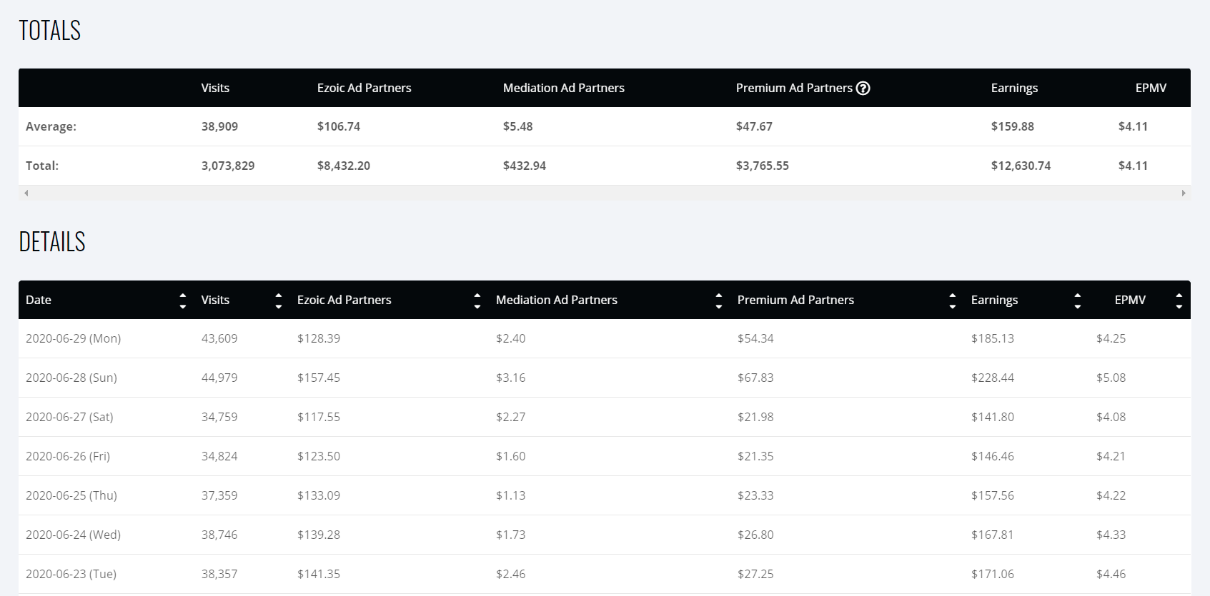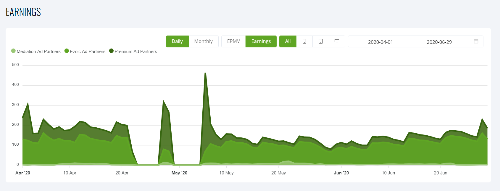 3. At the top of the Earnings Report page, you'll notice a graph that tracks daily earnings and EPMV (Earnings Per Thousand Visitors). You can toggle between viewing daily or monthly earnings, EPMV, Ad Partner earnings, and device type.