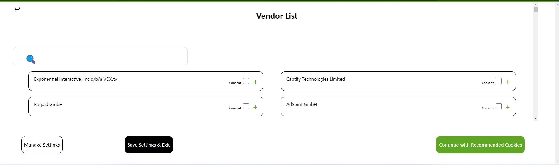 Se gli spettatori decidono di cliccare sull'elenco dei fornitori, possono accedere a un elenco completo dei fornitori del tuo sito e acconsentire a ciascuno su base di opt-out.
