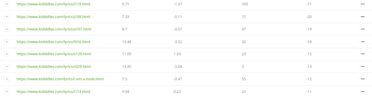 - Click the plus sign (+) next to a URL to see suggested keywords that can help recover lost traffic. For each keyword suggested, the change in traffic and in rank are displayed.