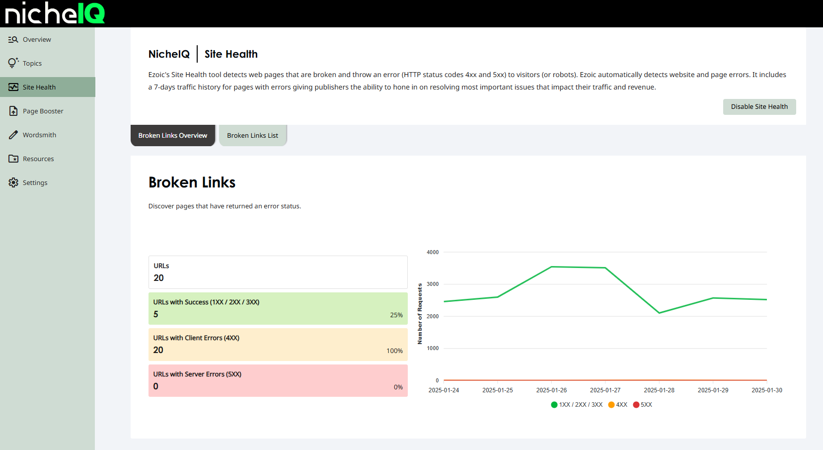 The Broken Links tool from NicheIQ automatically detects website and page errors that occurred in the last 7 days. This tool helps users identify and resolve issues that negatively impact traffic and revenue. By understanding the nature of these errors and their frequency, users can take corrective actions to improve the user experience on their websites.