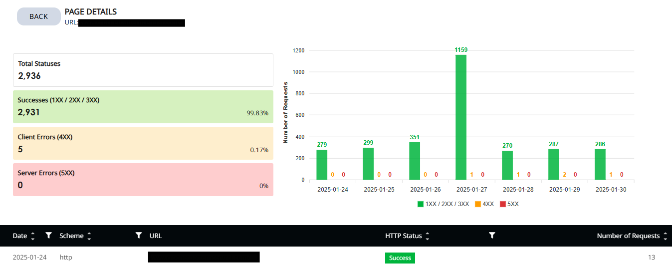 The Broken Links tool provides an overview of detected errors, including the total number of errors, types of errors, and their frequency. The dashboard displays total errors by status code type, an interactive line graph for date-specific counts, and a list of URLs with sortable data for successes, client errors, server errors, total errors, and success percentages.