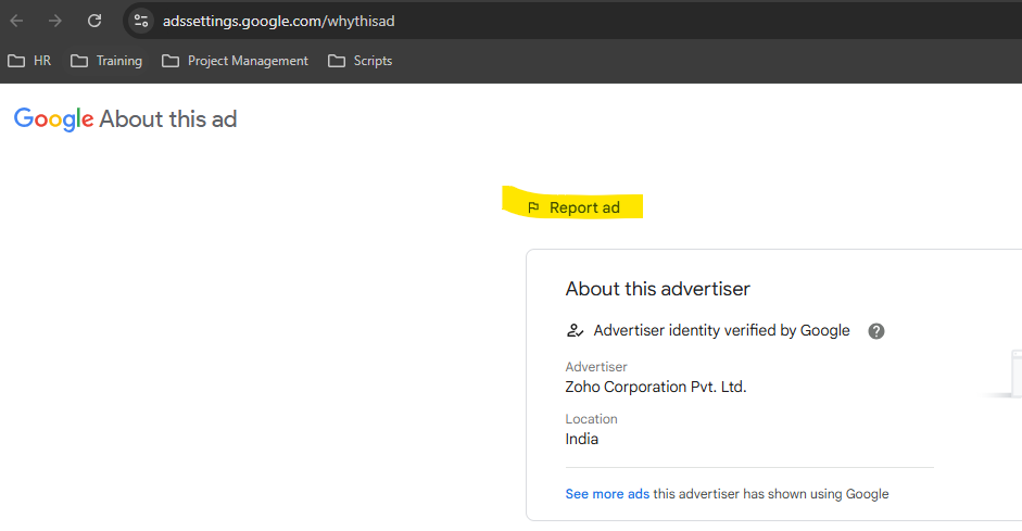 2. Click the 'Report Ad' link in the new window: