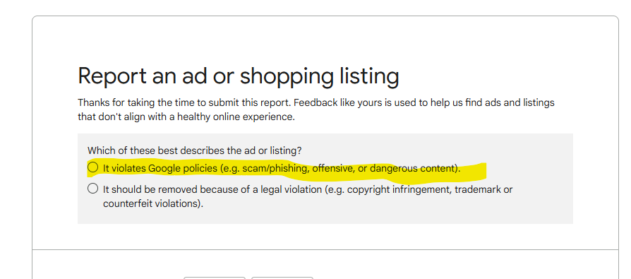 3. Select the 'It violates Google policies (e.g. scam/phishing, offensive, or dangerous content).' option: