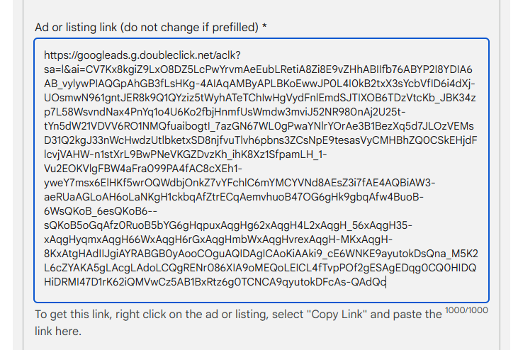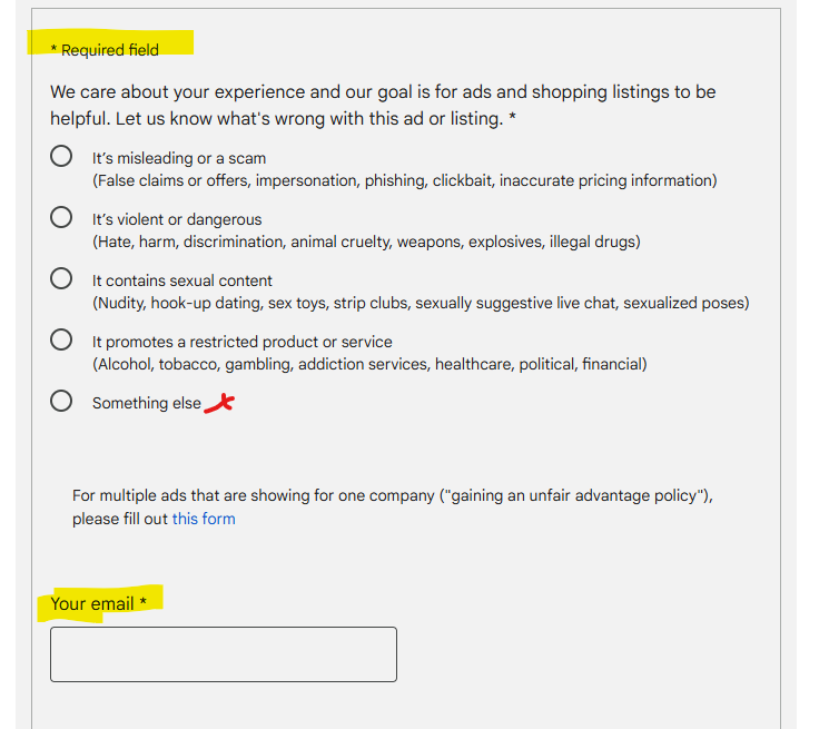 If reporting for being unable to close, select the 'Something else' so that information can be provided. If manually coming to this page, you will need to paste the Click Through URL into the 'Ad or listing link (do not change if prefilled):