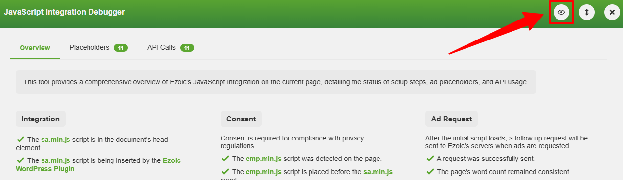 Los editores pueden preguntarse cómo pueden ver la configuración de los marcadores de posición en su sitio después de integrarse a través de JavaScript. La extensión de Chrome de Ezoic se puede usar para ver la configuración de marcadores de posición en un sitio integrado a través de servidores de nombres o Cloudflare, pero no con JavaScript. En su lugar, el Depurador de JavaScript de Ezoic incluye la funcionalidad para ver la configuración de los marcadores de posición en un sitio integrado a través de JavaScript, lo que facilita visualizar exactamente dónde se encuentran los anuncios en la página y ver su estado de un vistazo.