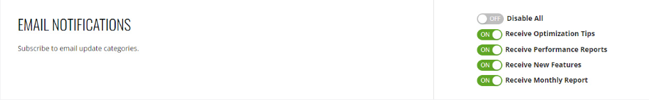 You can manage email notifications from Ezoic via the Dashboard > Ezoic Account Details: