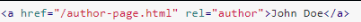 The Author hyperlink rel="author" can indicate the author by pointing to a link with the author's name.