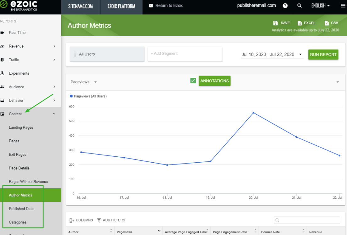 Big Data Analytics allows you to gain unique insights into your content by analyzing various metrics based on Author Name, Published Date, Category, and Content Age. Some of the key metrics include Engagement Rate and Bounce Rate. To find these reports, log in to your Ezoic Dashboard and navigate to 'Analytics'. Once inside Big Data Analytics, go to the 'Content' tab where you'll find 'Author Metrics', 'Published Date', and 'Categories'.