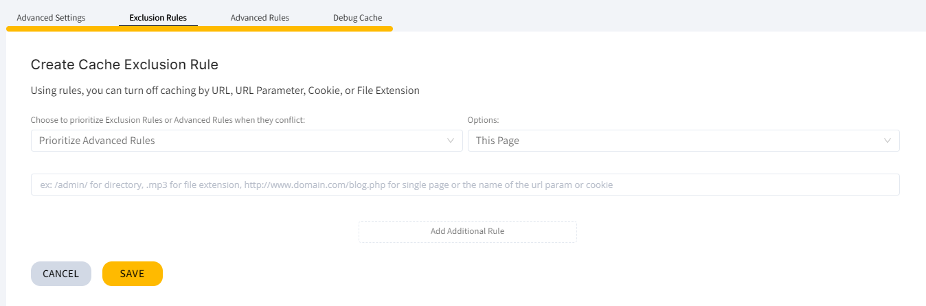 • Dans l'application Caching, faites défiler jusqu'à la section Paramètres avancés, cliquez sur l'onglet 'Règles d'exclusion', puis cliquez sur 'Créer une nouvelle règle'.