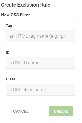 Select Class, ID, or Element under Exclusion Filters. Then enter the relevant class, ID, or element. You can also choose whether you'd like the filter to apply to all form factors (desktop, mobile, tablet) or just to desktop.
