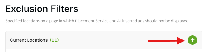 Navigate to EzoicAds > Ad Configuration > Exclusion Filters, then click the green plus + button to add a new exclusion filter.