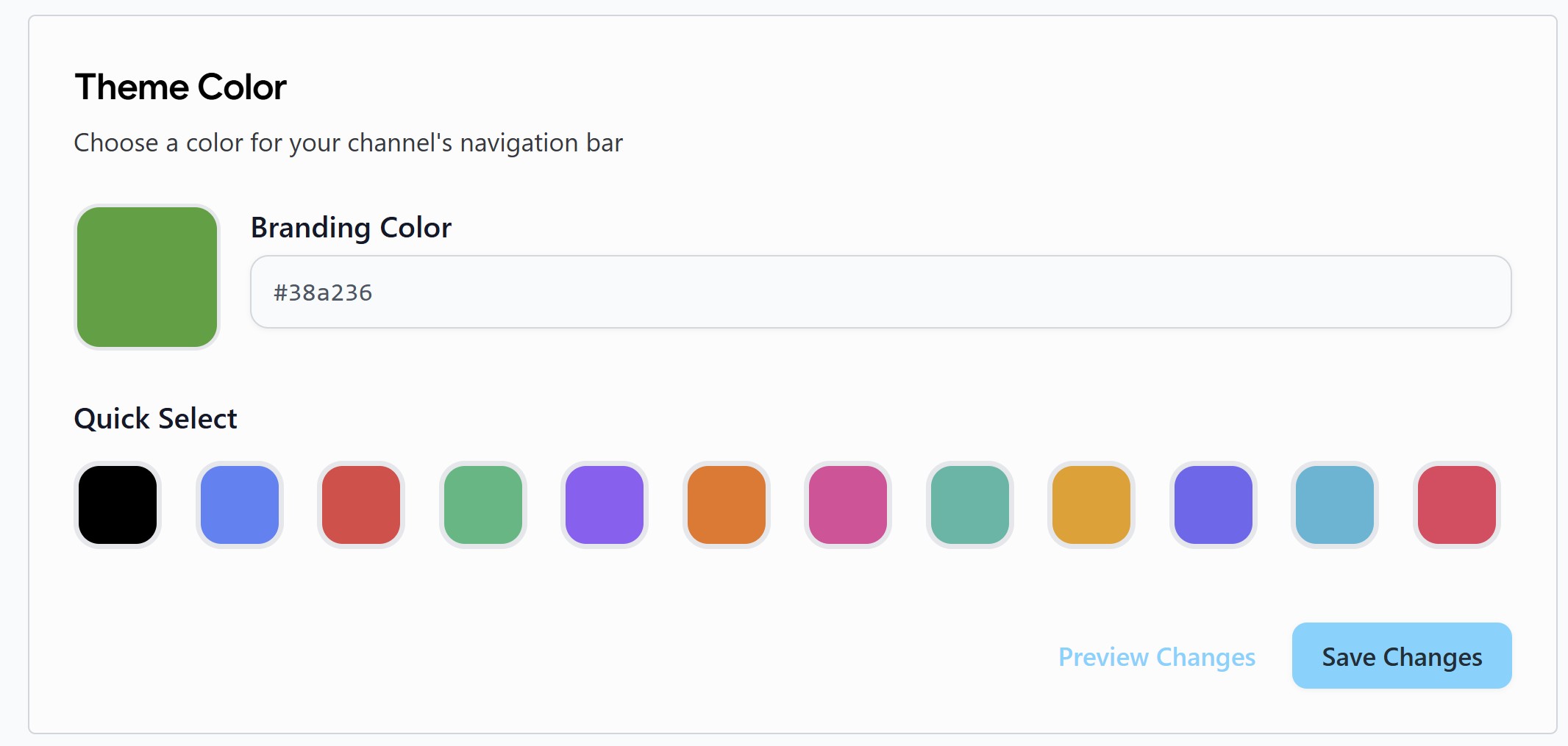 Farbthema: Wählen Sie ein Farbthema, das zu Ihrer Markenpalette passt. Sie können entweder den Farbwähler verwenden, um jede beliebige Farbe auszuwählen, oder aus vorkonfigurierten Farboptionen für eine schnelle Einrichtung wählen. Ihr Farbthema wird in Ihrer gesamten Kanalschnittstelle für Schaltflächen, Hervorhebungen und andere UI-Elemente verwendet.