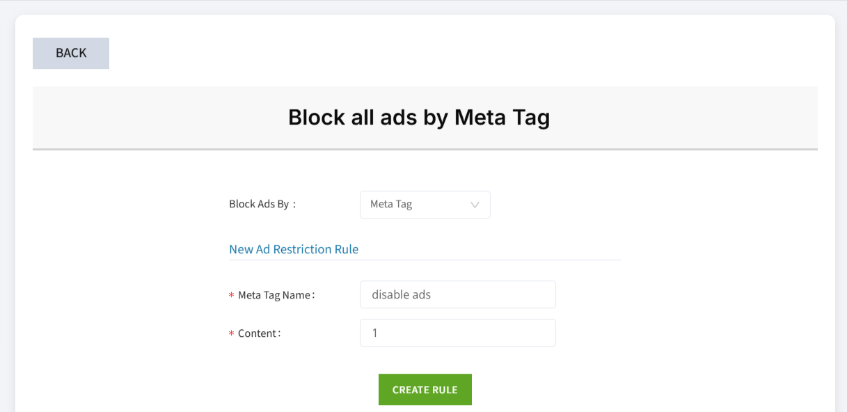 9. Wählen Sie 'Meta Tag' aus dem Dropdown-Menü, geben Sie dann 'disable ads' neben 'Meta Tag Name' ein und '1' neben 'Content'. Klicken Sie schließlich auf 'Create Rule'.