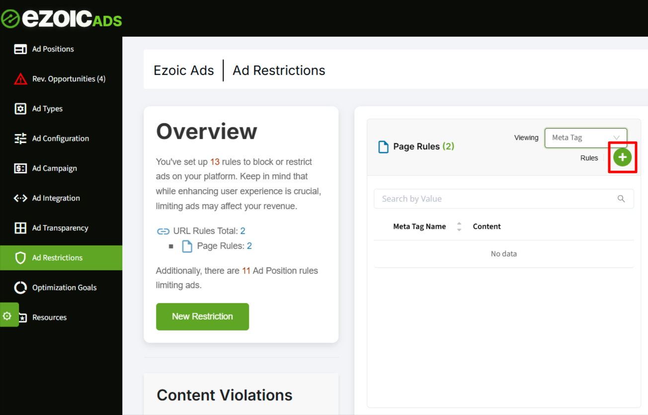 8. El último paso es crear una regla para deshabilitar los anuncios cuando Ezoic detecte la etiqueta meta que acabas de agregar a tus páginas wp-admin. Puedes hacerlo a través de https://pubdash.ezoic.com/ezoicads/adrestrictions. Bajo 'Reglas de página', haz clic en 'Nueva restricción'.