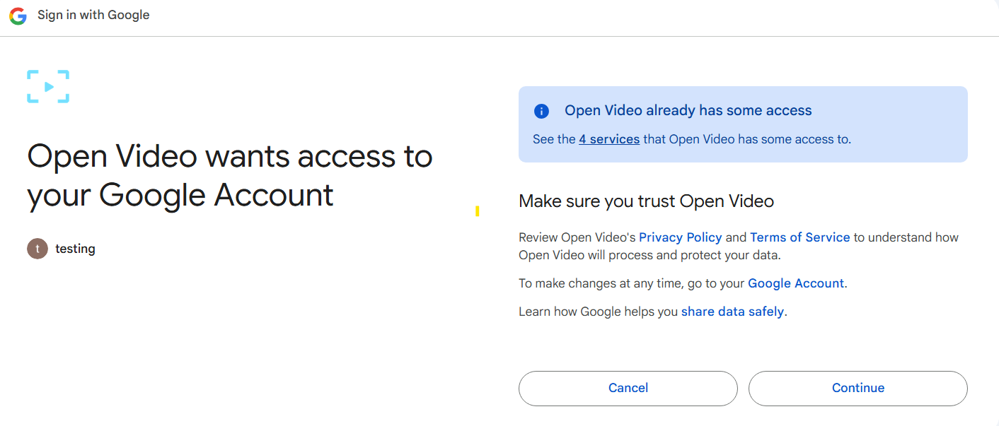 If you are linking YouTube for the first time click ‘Link New YouTube Channel’, and you will be redirected to a Google authorisation page to link Open.Video and YouTube. Select the account you would like to link to Open.Video and click ‘Continue’.