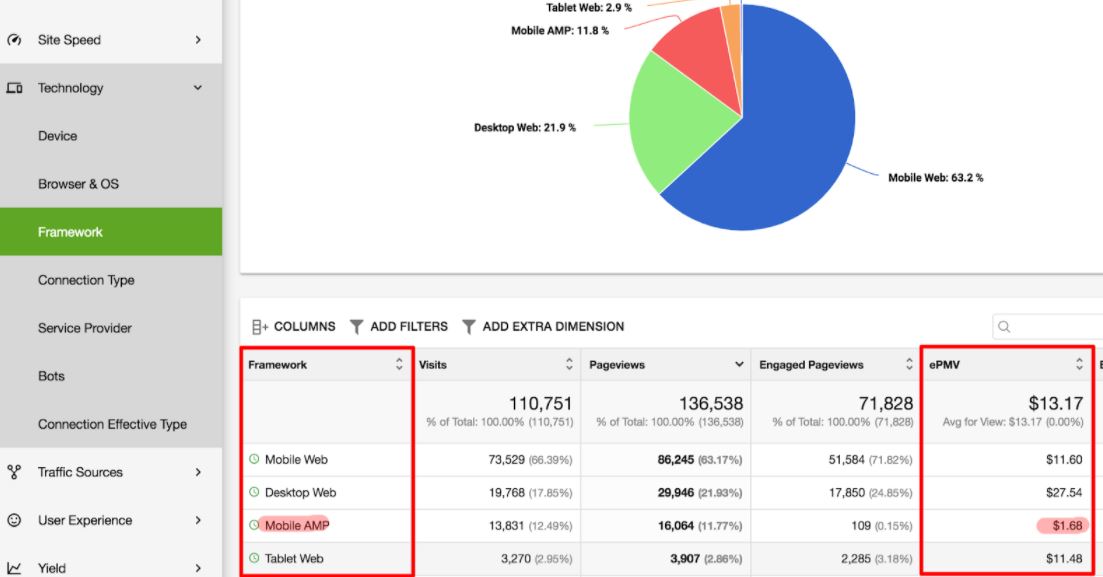- Technology -> Framework: Analyze revenue and EPMV by device to identify discrepancies (note that on most sites, mobile EPMV will be lower compared to desktop), especially on AMP pages.