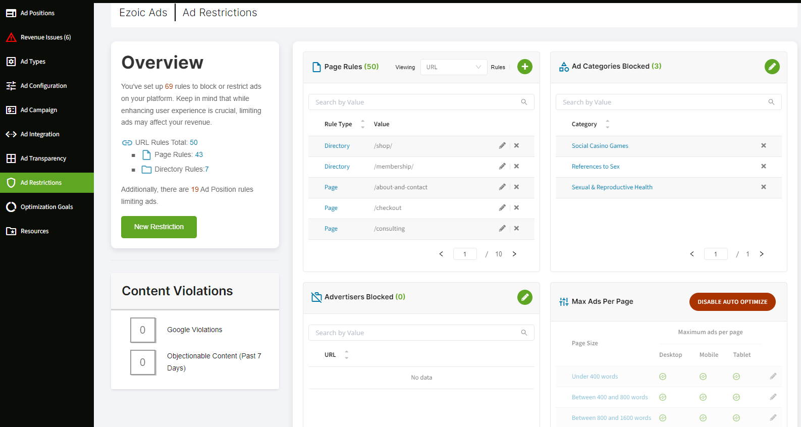 El filtro de contenido objectionable de Ezoic identifica palabras clave y páginas donde el servicio de anuncios está desactivado debido a violaciones de políticas. Los editores deben verificar regularmente esto en Configuración > Contenido > Contenido Objectionable o EzoicAds > Restricciones de Anuncios > Violaciones de Contenido y tomar las acciones correctivas necesarias para restaurar la difusión de anuncios y los ingresos.