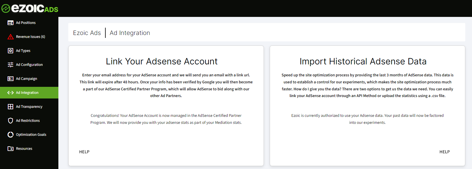 Vincular Adsense con Ezoic y habilitar la Mediación puede proporcionar un pequeño pero notable aumento en EPMV, normalmente entre un 1% y un 10%. El proceso implica navegar a Ezoic Ads > Integración de Anuncios y vincular la cuenta de Adsense, luego activar la Mediación e ingresar tus credenciales.