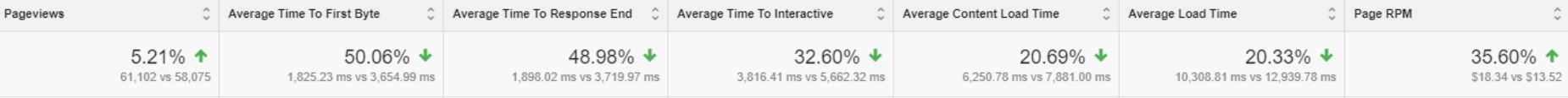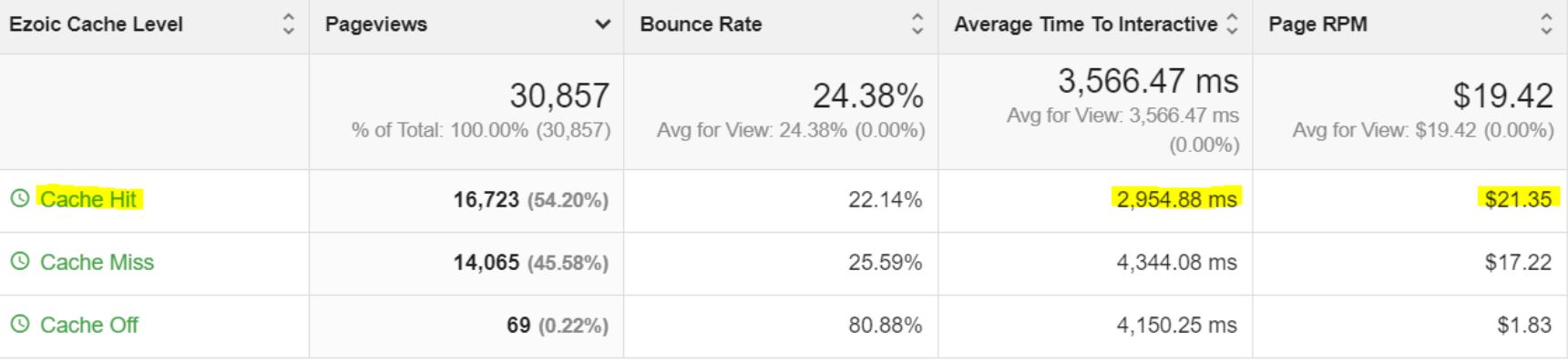 Per i siti integrati nel cloud, l'app cache di Ezoic può migliorare significativamente la velocità del sito e il reddito. Gli editori dovrebbero puntare ad almeno il 75% di hit della cache. L'efficacia della cache di Ezoic rispetto ad altre soluzioni di cache di terze parti può essere valutata utilizzando metriche come TTFB, TTI e RPM delle pagine nelle analisi Big Data di Ezoic tramite il rapporto di Caching.