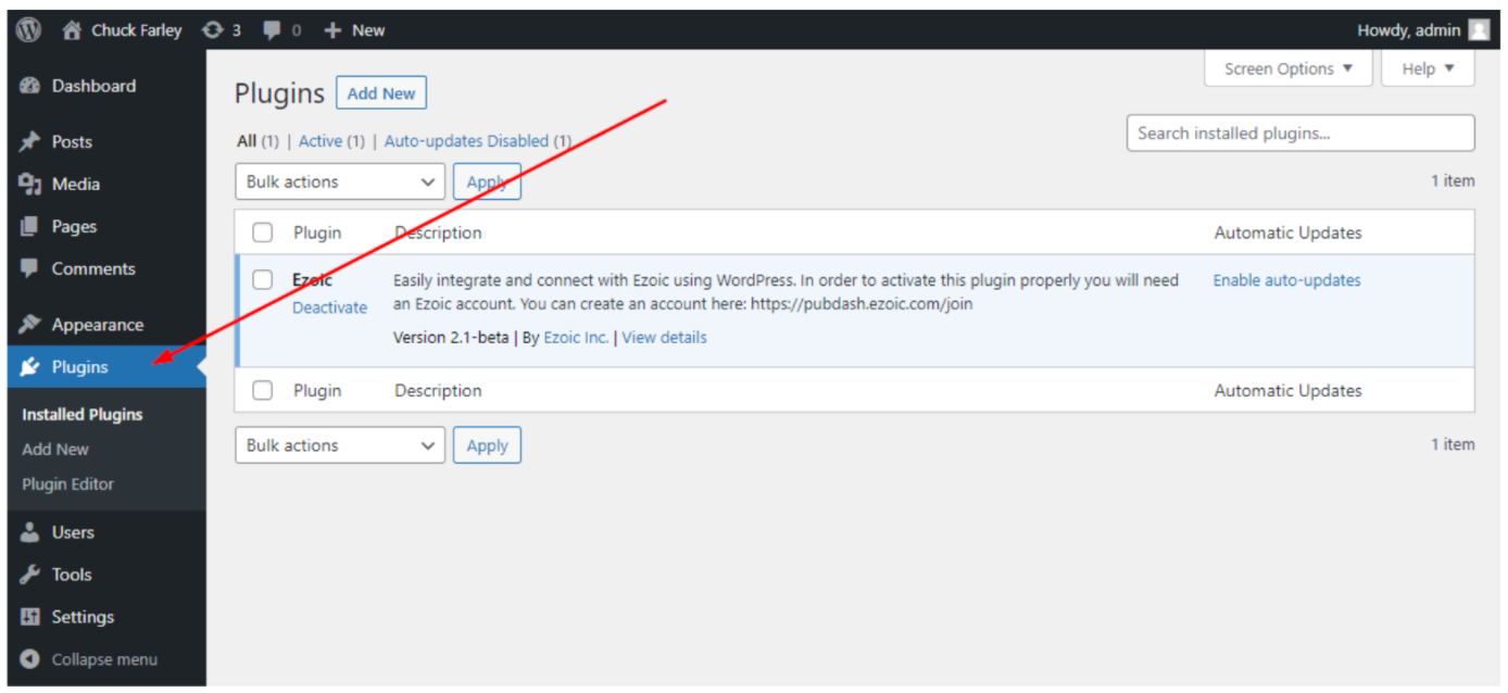 • Install the Ezoic Wordpress Plugin if it is not already installed. You can find the plugin available here.