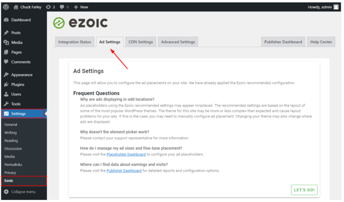• Navigate to "Settings," then "Ezoic," and select the "Ad Settings" tab.