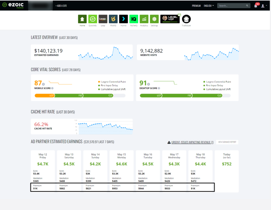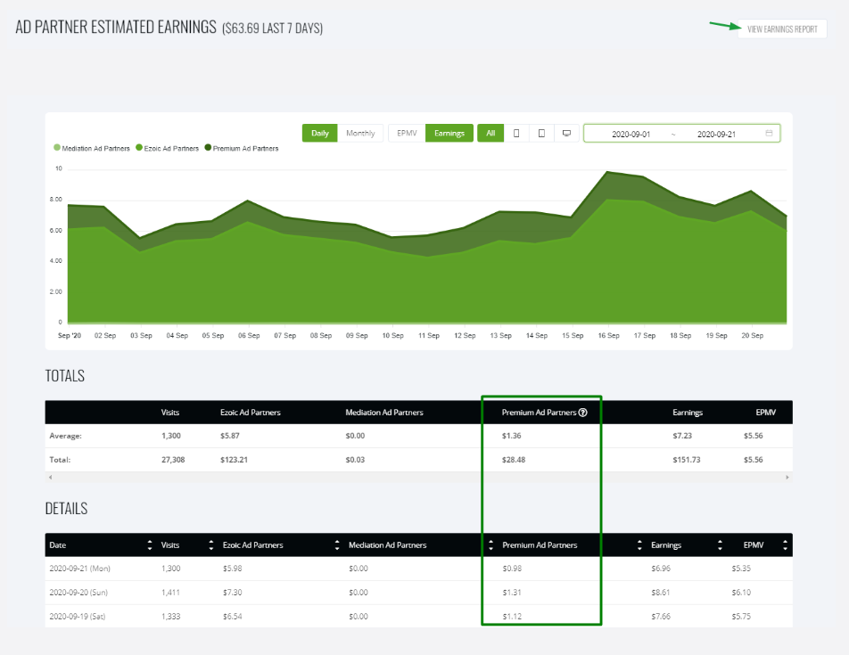 Premium earnings are separate from your Ezoic Ad Partner Earnings, so the Premium Revenue you are seeing is on top of what you have made on Ezoic Ad Partner earnings.