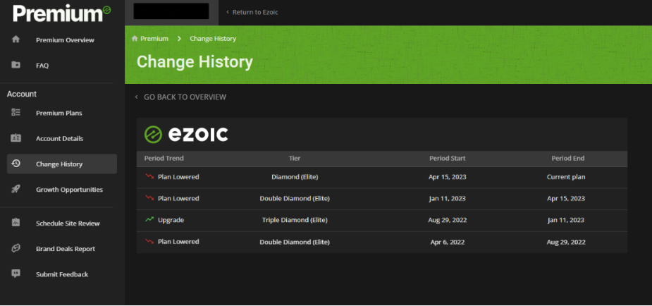 If you consistently receive less traffic or earnings and dip below your plan's monthly revenue quota (see what determines my plan level), you will be automatically dropped into a lower tier so that what you pay will reflect this. This feature is in place to protect you to ensure you are not losing money with Premium.