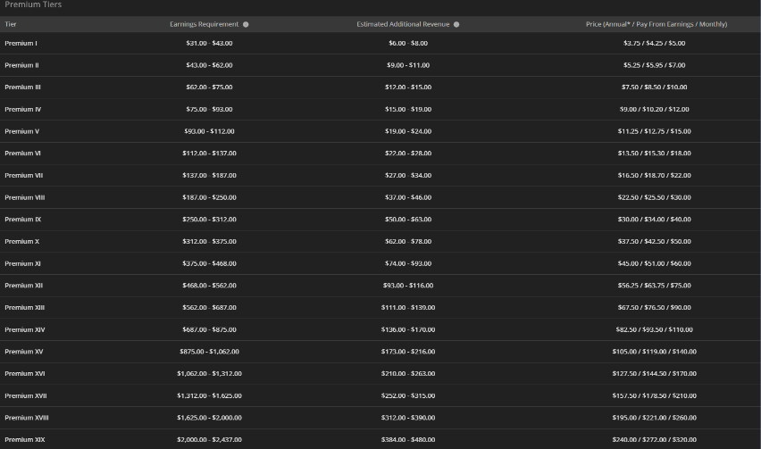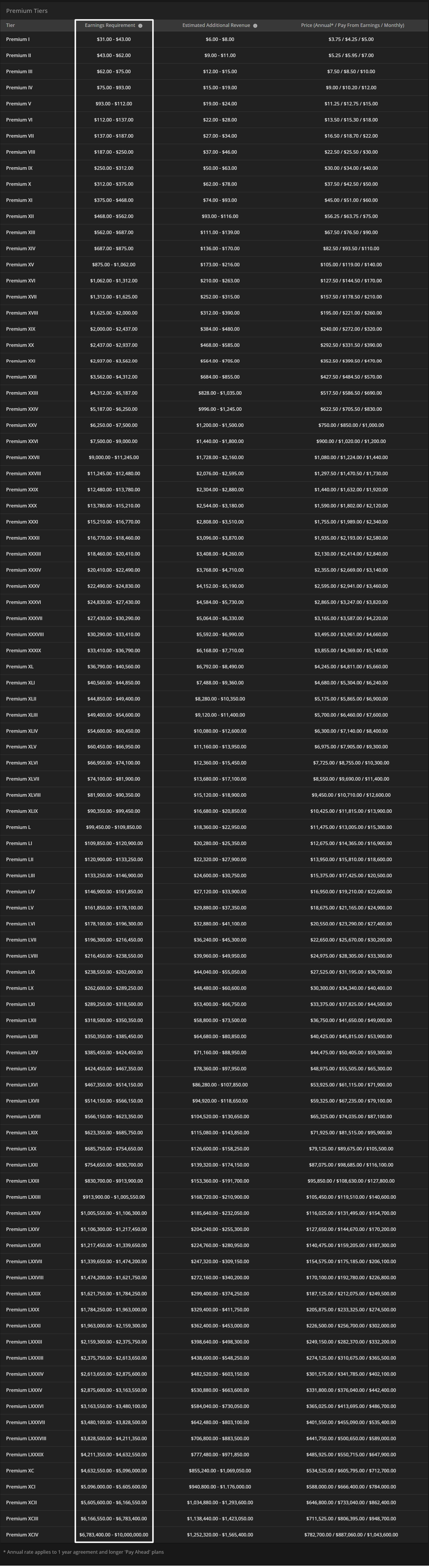 We have 95 total tiers for Premium. This helps with upgrade/downgrade transitions, and there is also a lower buy-in when initially starting Premium.