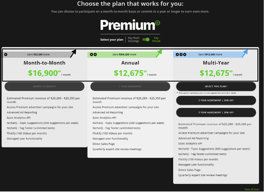 Publishers are placed in a specific plan level based on their last 30 days of Ezoic Ad Partner revenue - this does not include Premium Ad Partner revenue. You can see the ranges when viewing the plans.