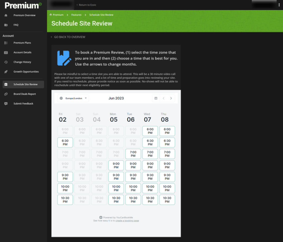 Publishers on the 'Preferred' or 'Elite' tiers can book a Premium site review (quarterly or monthly depending on your tier) with our team using the 'Schedule Site Review' option: