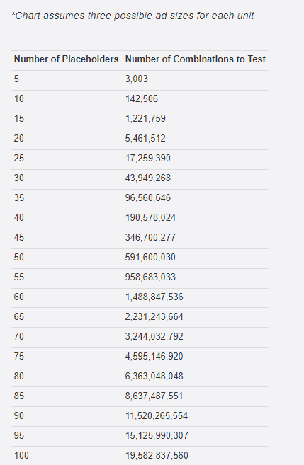 Das Testen verschiedener Anzeigelayouts und -positionen kann aufgrund der Vielzahl von Kombinationen, die bewertet werden müssen, ein komplexer und zeitaufwändiger Prozess sein. Zum Beispiel gibt es selbst mit dem empfohlenen Minimum von 15 Anzeigeneinheiten über eine Million mögliche Kombinationen zu testen. Diese umfangreichen Tests sind notwendig, um die effektivsten Anzeigenplatzierungen zu identifizieren und sind entscheidend zur Optimierung der Anzeigenleistung und Maximierung der Einnahmen.