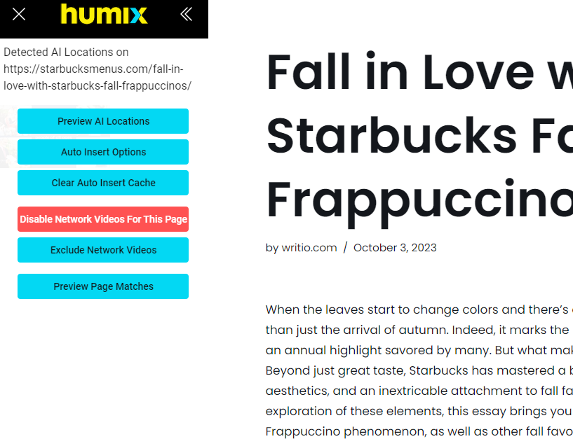 3. Attiva l'estensione Chrome di Ezoic e seleziona “Humix”. Apparirà una barra laterale a sinistra, presentando varie opzioni di interazione.
