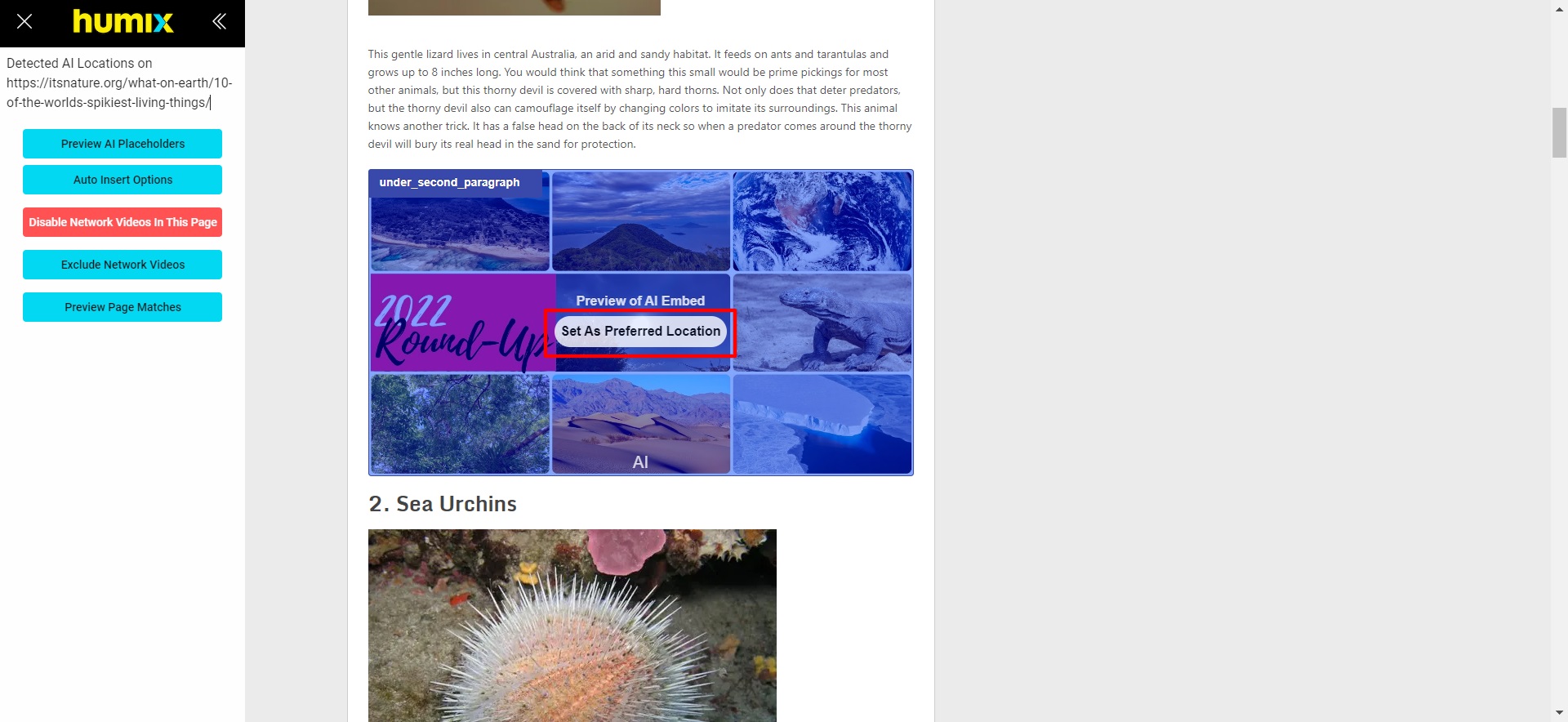 Dopo aver attivato “Anteprima posizioni AI”, avrai l'opzione di passare a una posizione diversa e predefinita. Per farlo, seleziona semplicemente “Imposta come posizione preferita”. Questa posizione verrà aggiornata come la tua posizione di auto-inserimento preferita in tutto il sito. Nota che se una pagina non è abbastanza lunga da includere la posizione selezionata, la prossima posizione disponibile sulla pagina servirà un video.