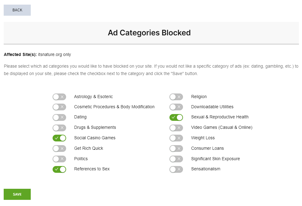 By default, categories such as 'Social Casino Games', 'References to Sex', and 'Sexual & Reproductive Health' are automatically blocked. However, users have the option to enable these categories if they wish, depending on their site's policy and audience requirements.