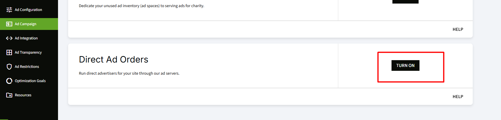 Puoi abilitare gli annunci diretti dal tuo dashboard di Ezoic navigando su Ezoic Ads > Campagna Pubblicitaria. Clicca su "Attiva" nella sezione Ordini di Annunci Diretti e poi potrai creare un nuovo ordine di annunci diretti tramite l'app. Puoi anche monitorare e aggiornare gli ordini di annunci diretti esistenti da questo dashboard.