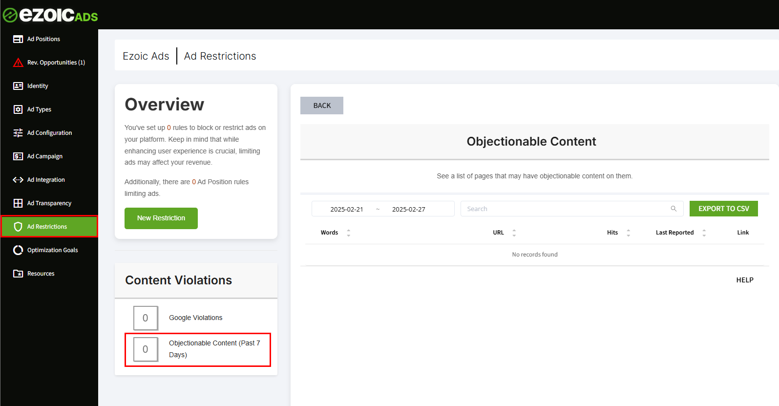 Das Inhaltsfilter-Tool meldet Vorkommen von umstrittenen Inhalten innerhalb der letzten 7 Tage. Sobald Sie Ihre Website aktualisieren, um diesen Inhalt zu entfernen, wird er nach 7 Tagen nicht mehr im Bericht erscheinen. Sie können dies überprüfen, indem Sie die Datumsbereichsfilter im Bericht so einstellen, dass sie am Tag nach der Entfernung des Inhalts beginnen. Beachten Sie, dass die Ezoic-Berichterstattung um die Mittagszeit PST für Daten des Vortages aktualisiert wird. Daher erlauben Sie etwas Zeit, bis die Updates in Ihrem Dashboard angezeigt werden.