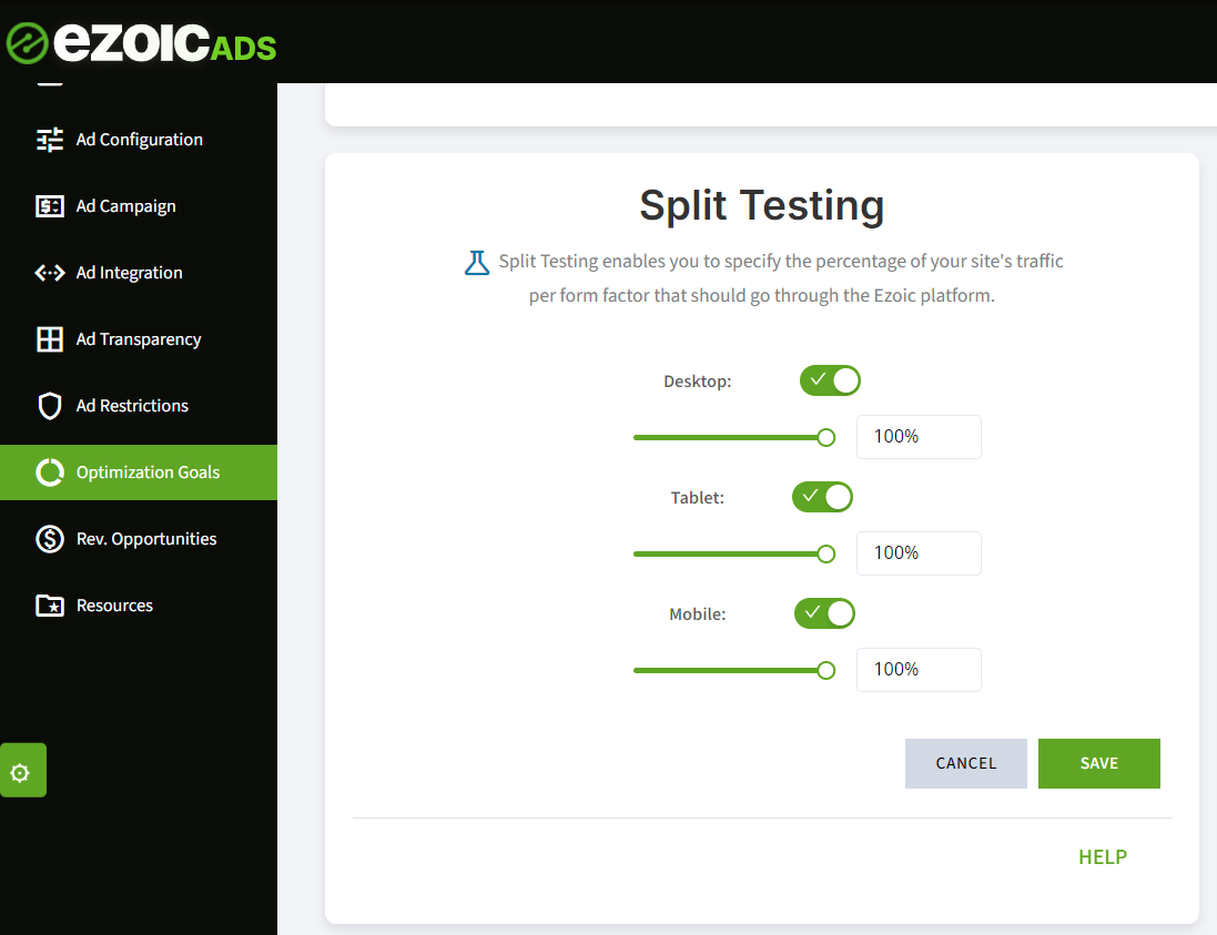 Please note that publishers on an annual Premium Agreement will not see this option because Ezoic will automatically be set to display 100% of the time.