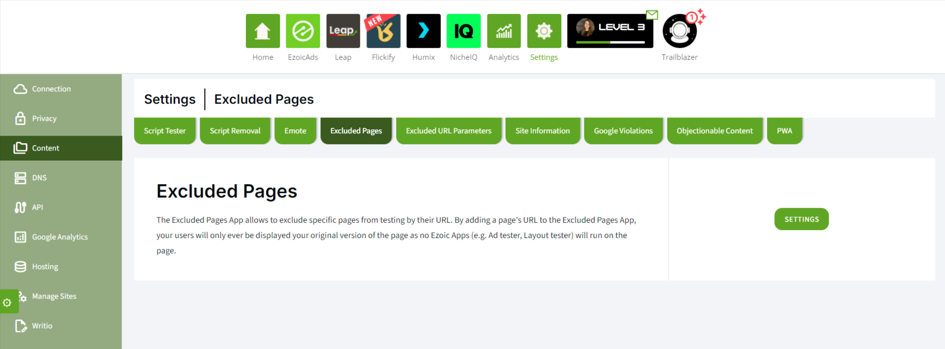 4. Excluded Pages: Ezoic can be disabled on specific URLs, and any AdSense ad units on these pages will display ads. You can check whether you have any such rules set up on your domain under Settings > Content > Excluded Pages.
