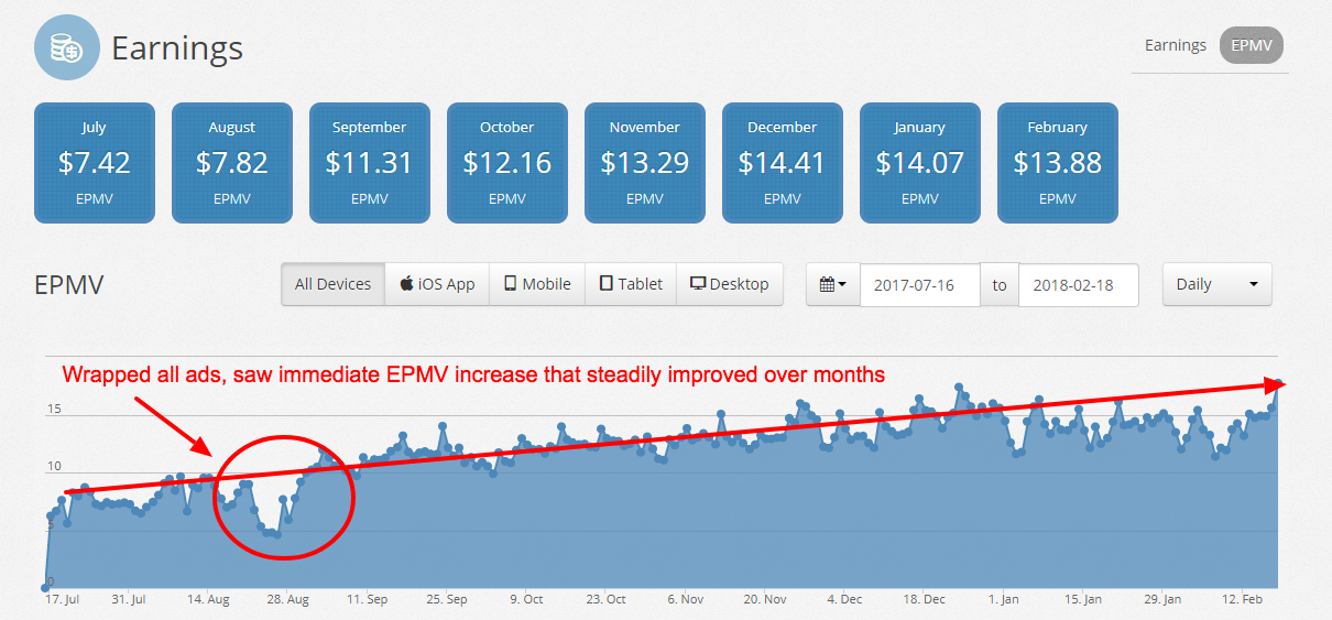 Once all the ads were wrapped on this website, EPMV nearly tripled. This resulted in an increase of nearly $500 per day in revenue.